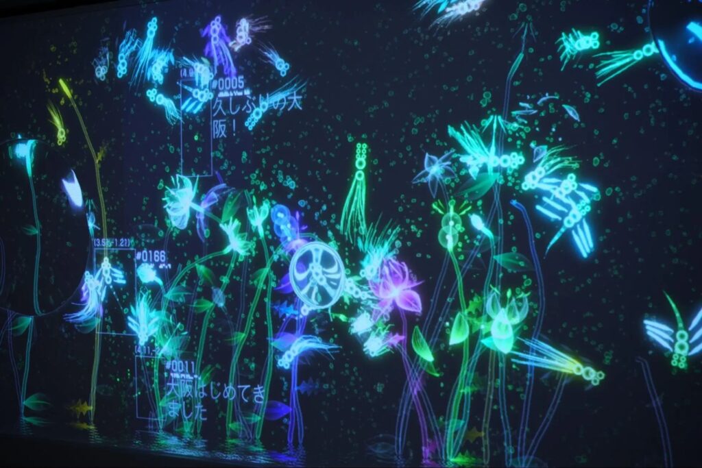 来場者がQRコードからメッセージを送信すると、それが“遺伝子情報”として作品に反映され、新たな植物がスクリーン上に生成されます。さらに、大阪市のリアルな天気データと連動し、生態系は日々ダイナミックに変化していきます。